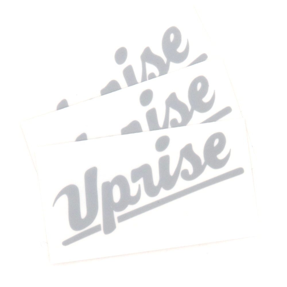 Transfer stickers or "decals" are cut-out of vinyl and are transferred to the desired surface via transfer tape. Uprise transfer stickers are weather resistant and can be used for both indoor and outdoor application.
