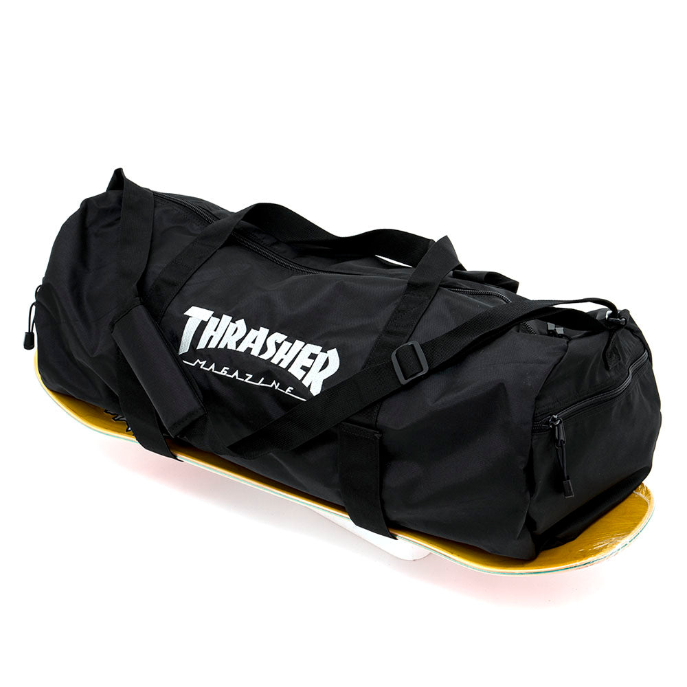 Large heavy-duty duffel bag with durable zipper. Fits skateboard inside or attach skateboard to outside with straps. Roomy end pockets with wet/dry compartment and "Thrasher Magazine" embroidered on the side. Also features an adjustable padded shoulder strap.